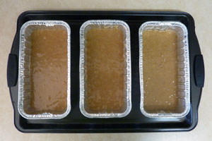 Note: I find it easiest to use the disposable loaf pans (don’t have to worry about getting them back from people) and place all three on a baking sheet. You know your oven best, but I’ve never had to rotate them during baking.
