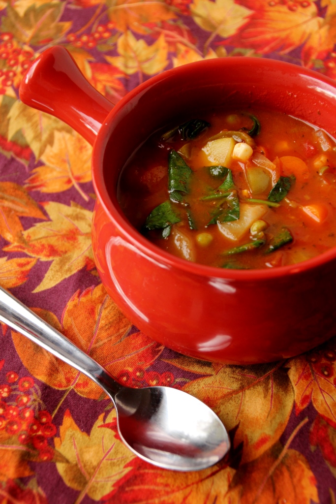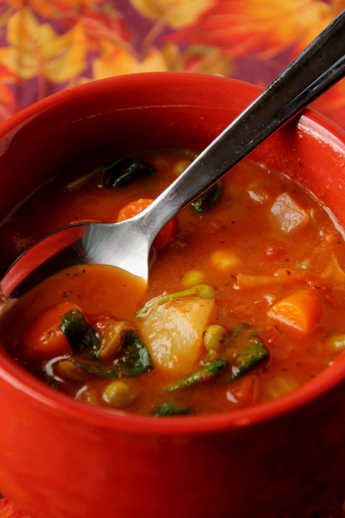 While traveling I ate a ton of delicious but not exactly healthy things, so now that I’m back I’m trying to do a little better in the eating department. While skimming Pinterest (like ya do) I whizzed passed a vegetable soup recipe that looked great. I didn’t really follow it so much as use it as a guideline, but I always appreciate the inspiration. Vegetable stock and spaghetti sauce make a yummy broth filled with whatever veggies suit your fancy. I threw in potatoes, celery (since we had some around), carrots, zucchini, bell pepper, green beans, corn, and peas, but you can easily tailor it to your preferences or to your supplies on hand. Pretty hard to go wrong here so just chop some fresh or throw in some canned/frozen options and you’re good to go.