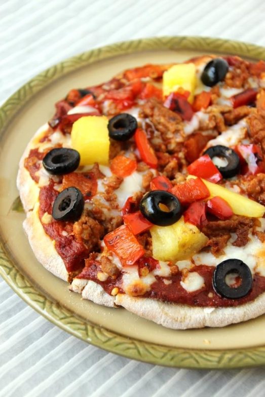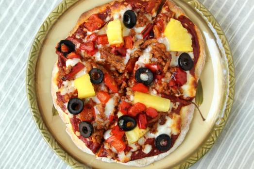I pre-baked the crust to make it a little sturdier for storage, then topped them all with my favorite mix of meat, produce, and cheese. I am one of those people who likes fruits on their pizza, so sorry (not sorry) in advance if my pineapple and mandarins repulse you. I made one that evening, then froze the remaining five before wrapping in plastic wrap and sealing in Ziplocs to try another day.