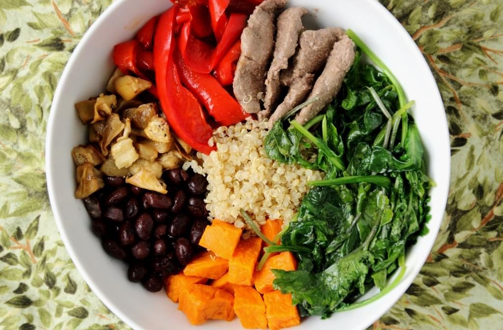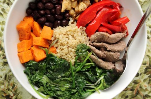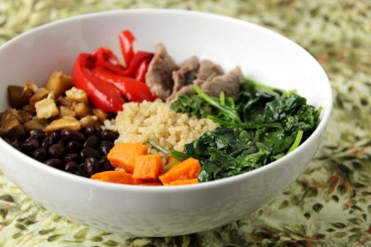 - When veggies and quinoa are both cooked, return to your large bowl and gently stir in black beans and corn until evenly distributed.