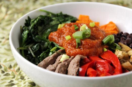 Roasted sweet potatoes, bell peppers, and red onions are stirred in with a generous helping of black beans, corn, and quinoa. Vegan by nature, it can be dressed up with cheese or meat if you like. Goat cheese is my personal preference (shocking) since the creaminess blends so nicely with the smokey dressing.